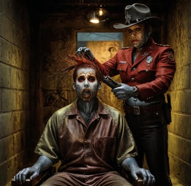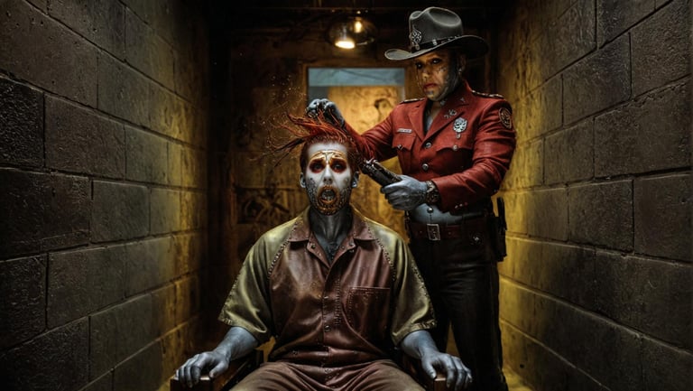 Part 2 - The Potential Prisoner Swap They shuffled into the small Canadian border-town jail under heavy RCMP escort, handcuffed, muddy, and miserable. The jail itself wasn’t what they expected — no cold dungeons or scary iron bars. Instead, it looked more like a rustic hunting lodge. Warm wooden walls, clean floors, three cozy cells in a row. There were even little paintings of moose on the walls. It would have been almost comforting — if not for the handcuffs, the angry Mounties, and the stench. “Alright, boys,” the lead officer said cheerfully, “you smell like a cow's backside in July. Time to get cleaned up. Strip!” Donnie Jr. gulped, trembling. They were marched into the delousing room — a big tiled shower space with a rusty metal drain in the center and a massive overhead sprayer.