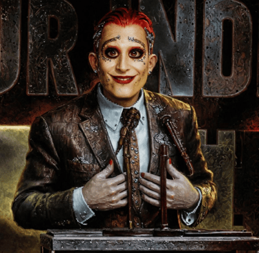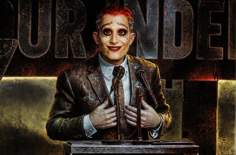 Robert was led through a maze of hallways until he was deposited in Grump’s private suite at 6:55 AM. The moment the door closed behind him, he was struck by the room’s sheer insanity. The walls were painted in chaotic rainbow swirls, the colors clashing and blending in a way that made his head spin. A massive portrait of Donold J. Grump hung over the fireplace, depicting the President-Elect shirtless, riding a dragon through a stormy sky.